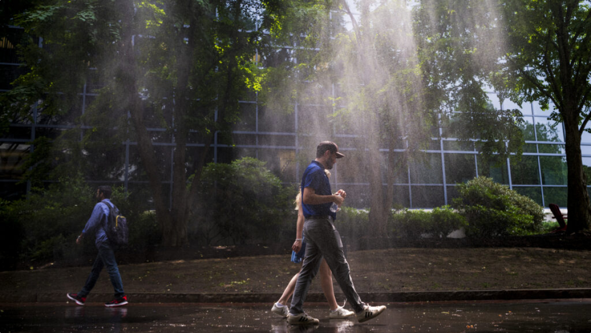 07/27/23 – Boston, MA – Members of the Northeastern community walk beneath the new misters between Ruggles and Snell Library on Thursday, July 27, 2023. The misters are part of the Climate Justice and Sustainability Hub’s Cool Spot Pop-Up to help the community beat the city heat in the summer. Photo by Alyssa Stone/Northeastern University